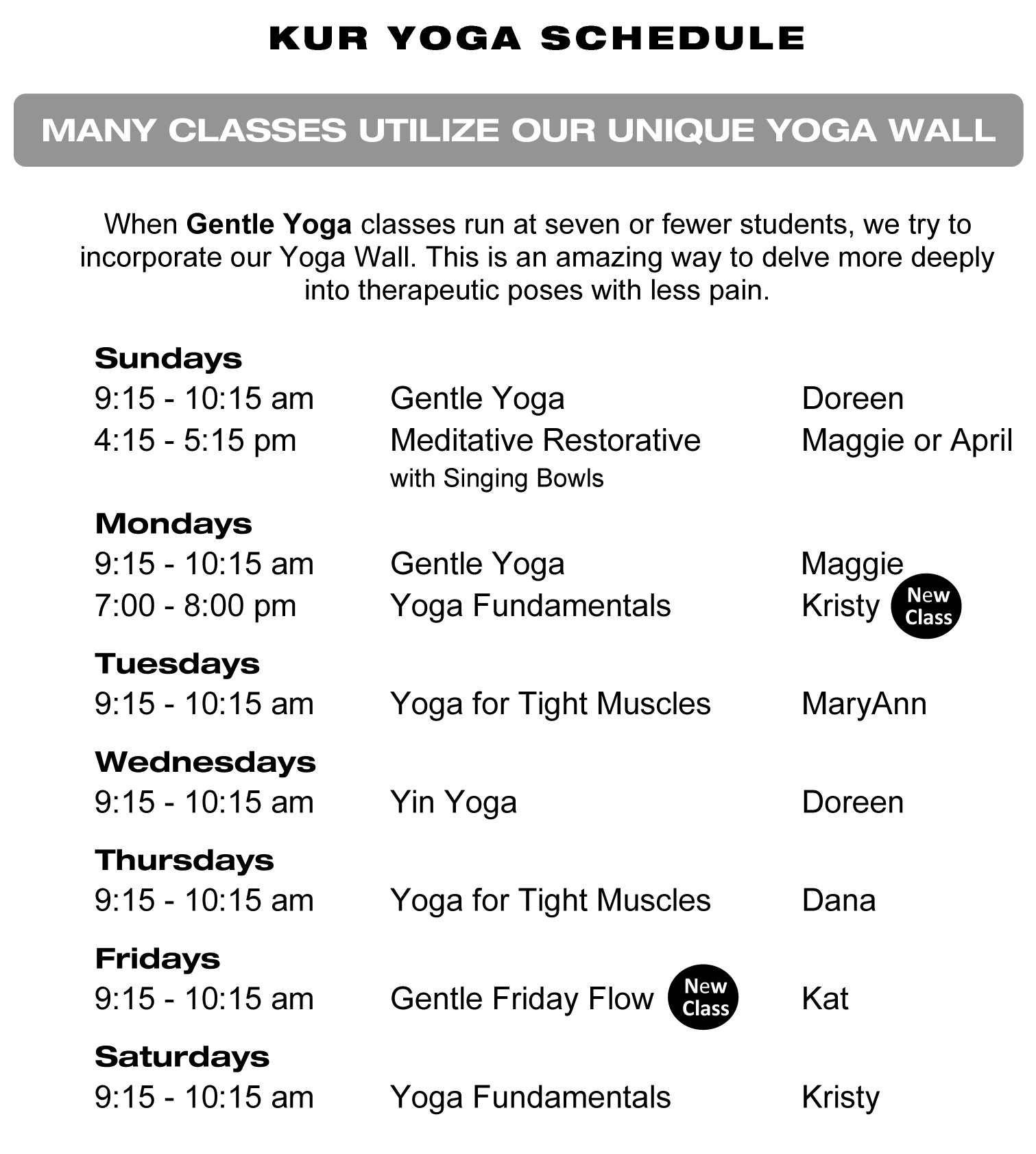 Blending gentle yoga and slow flow into a grounding practice that helps you release the week and ease into the weekend. Breath, gentle floor and standing postures, and mindful movement create space for stretching, reflection, and deeper body awareness. The slower pace allows time to settle into each pose, explore modifications, and move in a way that supports all levels of experience. Classes with seven or fewer students will typically utilize our Great Yoga Wall.